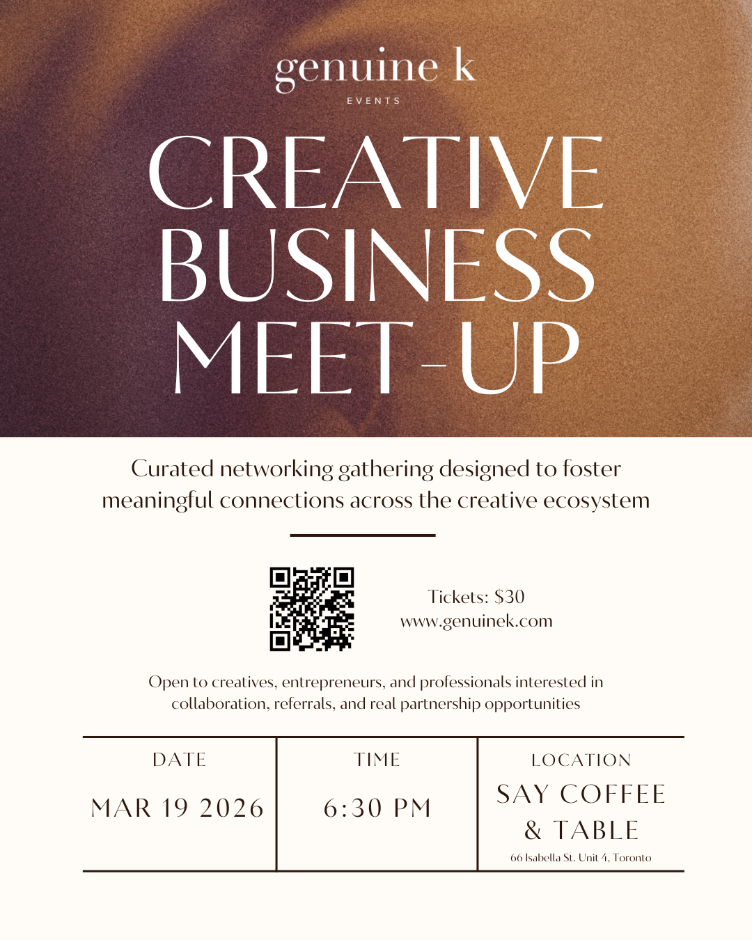 Genuine K events are for creative professionals, business leaders, and anyone curious about working with or supporting creative communities. You do not need to identify as an artist to attend—only a genuine interest in storytelling, collaboration, and thoughtful conversation.